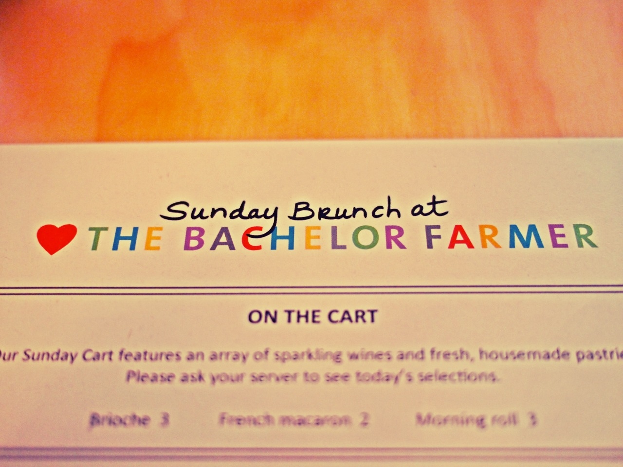 Hi ho the Derry -oh! The Bachelor Farmer hosted it’s first public brunch Sunday, so obviously we had to go. We got there before the doors opened, but got to catch up a little with Steve Holt at the bar. The Dayton boys were at the bar, keeping an eye on their kingbrunchdom, and likely enjoyed my morning witty repartee.